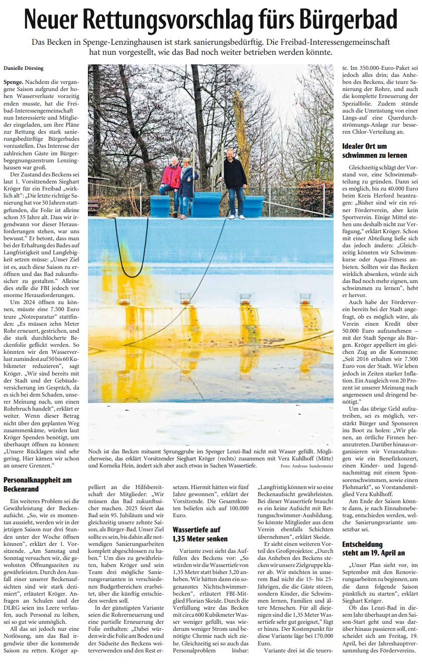 Bürger, Vereine und Ratsherren aus Lenzinghausen gründeten daraufhin die „Interessengemeinschaft Freibad Lenzinghausen“ und wählten Hermann Helling zum Vorsitzenden. Neben Forderungen an die Stadt wurden eigene Initiativen gestartet, darunter Arbeitseinsätze und Spendenaktionen. Nach Verhandlungen beschloss der Stadtrat, das Bad weiter zu betreiben und zu modernisieren.